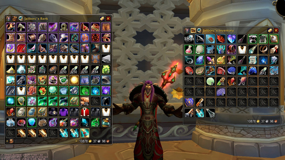 Combines all bags into a single searchable window, with colored item borders and simple inventory management.