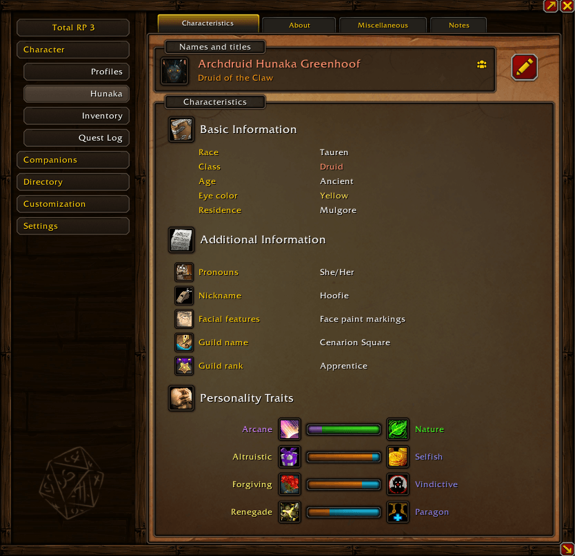 Deep role-play toolkit that lets you create rich character profiles, descriptions and RP flags.